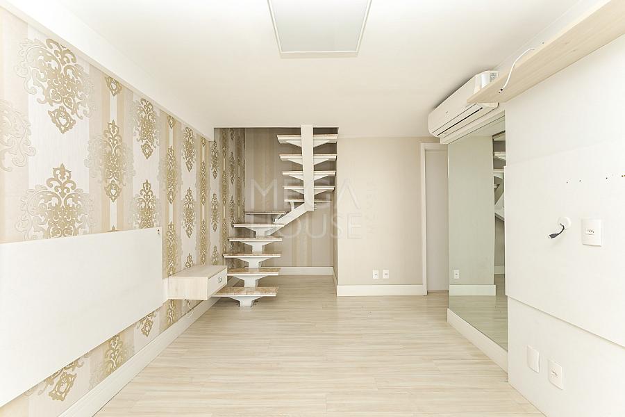 Com 94 m² no pavimento inferior e aproximadamente 25 m² no pavimento superior, esse apartamento garden no bairro Vila Izabel conta com 2 quartos, podendo ser revertido para 3 quartos, sendo 1 suíte e no mezanino uma closet enorme, além de uma sala íntima / home office.