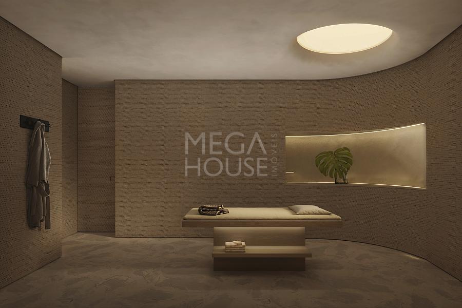 Áreas comuns completas: salão de festas integrado à piscina, brinquedoteca, gourmet, piscinas interna e externa aquecidas, espaço fitness com equipamentos Technogym, beauty space, sauna, spa, quadra com grama natural e concierge.