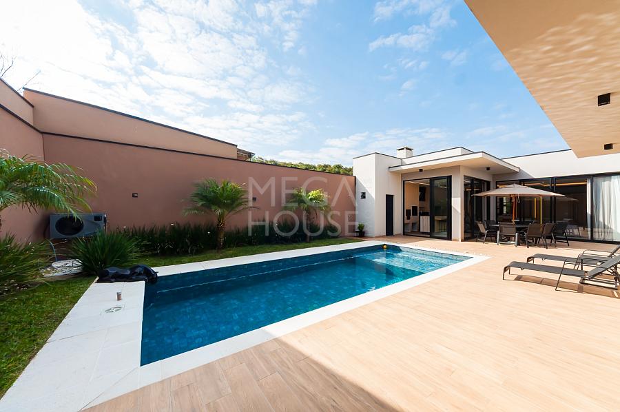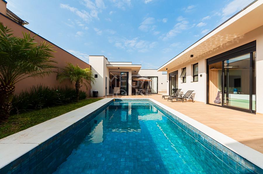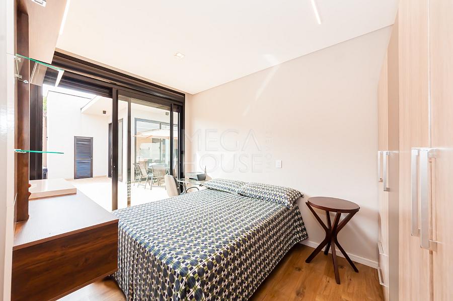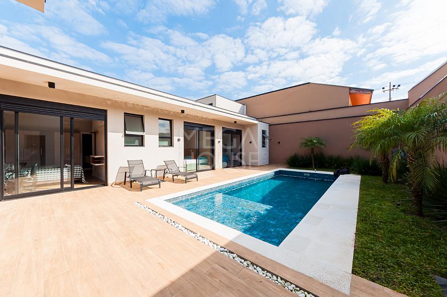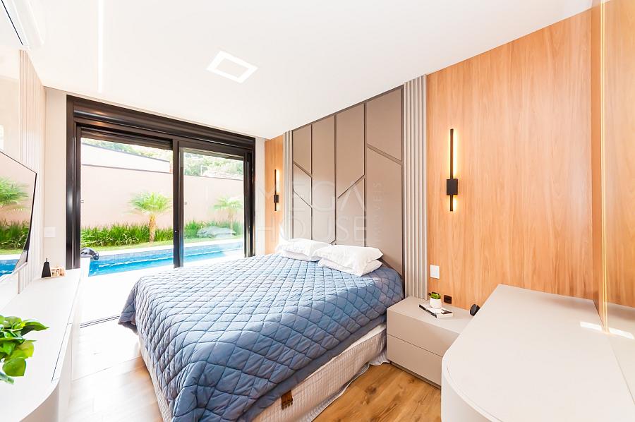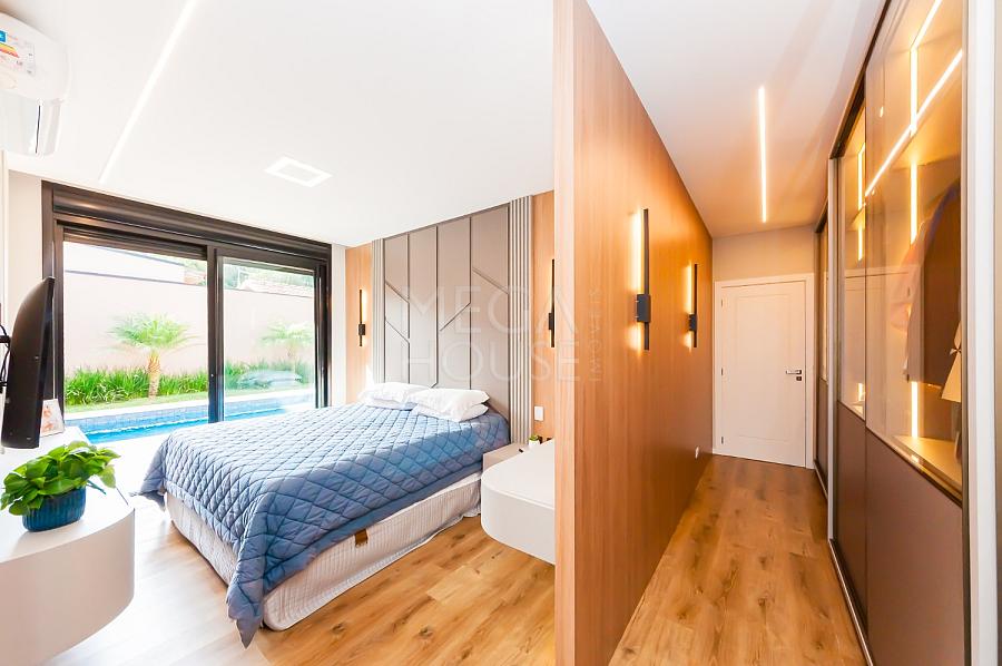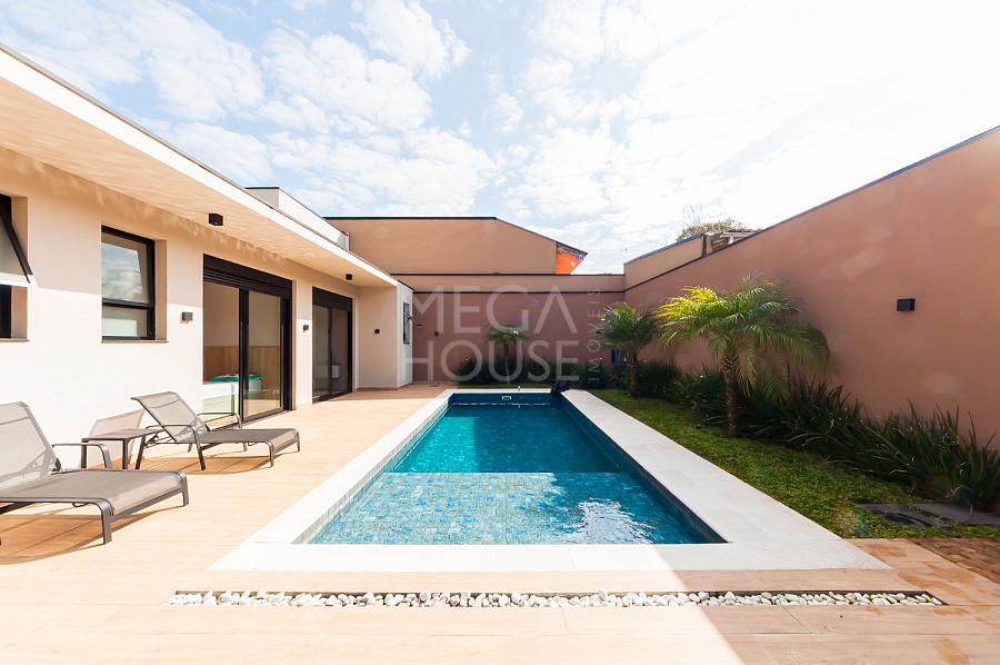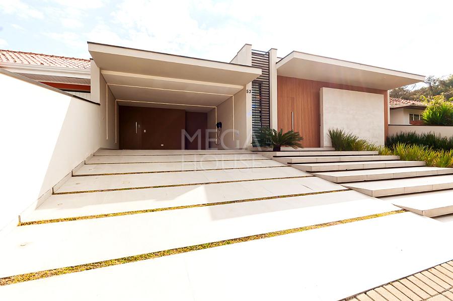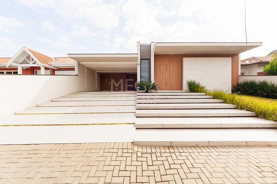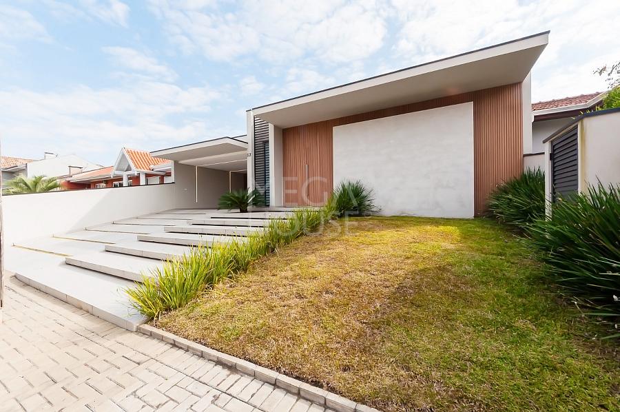 Localizada em condomínio fechado no bairro São Braz, em Curitiba, esta casa térrea com aproximadamente 375m² privativos, foi concebida para quem valoriza conforto sem excessos — e sem escadas.